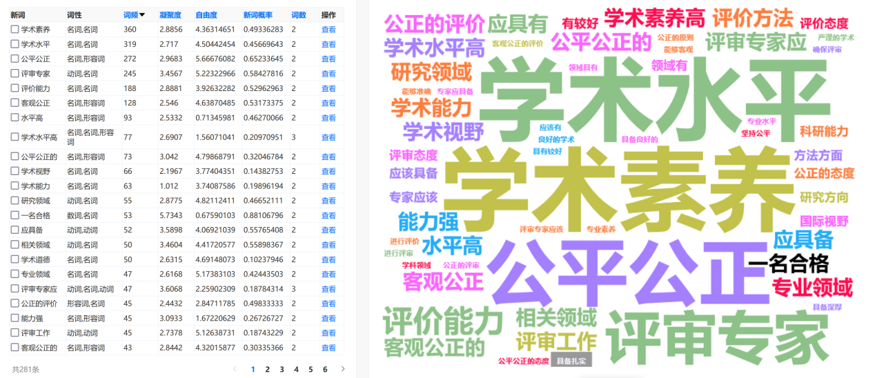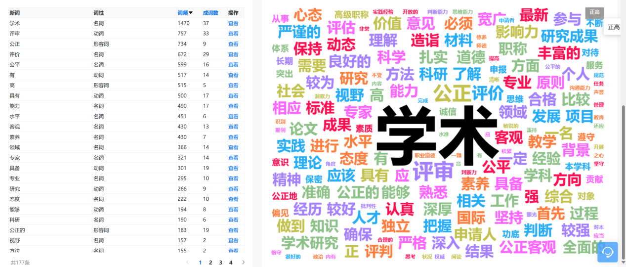 課題組又對(duì)熱點(diǎn)詞匯進(jìn)行了統(tǒng)計(jì)分析,發(fā)現(xiàn)“學(xué)術(shù)”1470條、“評(píng)審”757條、“公正”734條、“評(píng)價(jià)”672條、“公平”599條等詞匯排名前5位。再次印證了高質(zhì)量的評(píng)審專(zhuān)家應(yīng)該具備“學(xué)術(shù)”“公正公平”和“評(píng)審評(píng)價(jià)能力”等重要素質(zhì)。