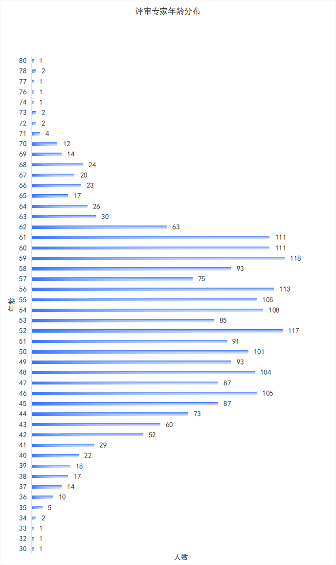 2252名評(píng)審專(zhuān)家的年齡分布從30歲到80歲不等,年齡分布呈現(xiàn)正態(tài)分布。其中,年齡分布最集中的在46-50、51-55、56-60三個(gè)階段,即46-60歲的占到全部人數(shù)的66.88%。此外,45歲以下專(zhuān)家的占比為17.41%;60歲以上專(zhuān)家的占比為15.72%。這種年齡結(jié)構(gòu)確保了評(píng)審具有較好的代表性。