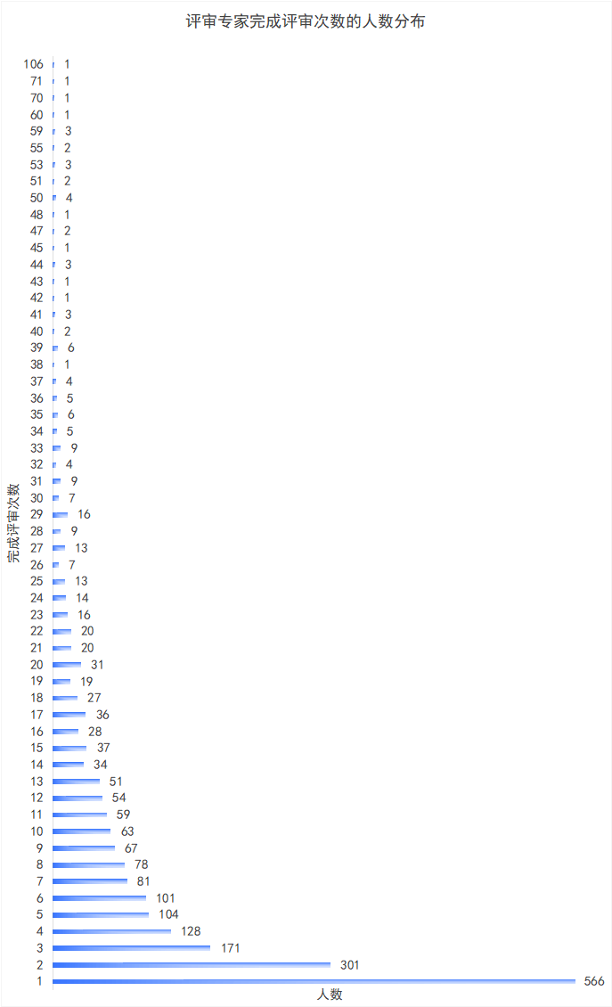 評(píng)審是一項(xiàng)實(shí)踐性很強(qiáng)的活動(dòng),評(píng)審專(zhuān)家只有通過(guò)不斷積累評(píng)審經(jīng)驗(yàn),才能有助于積累評(píng)審相關(guān)知識(shí),熟練評(píng)審相關(guān)技能。因此,評(píng)審經(jīng)歷是判斷評(píng)審專(zhuān)家專(zhuān)業(yè)性的重要參考。由此,本次調(diào)研特意統(tǒng)計(jì)了評(píng)審專(zhuān)家的評(píng)審經(jīng)歷。從專(zhuān)家完成評(píng)審次數(shù)情況來(lái)看,2252名評(píng)審專(zhuān)家完成評(píng)審的平均次數(shù)為9次。其中,評(píng)審數(shù)量最多的一位專(zhuān)家評(píng)審過(guò)106次。評(píng)審次數(shù)為1次的人數(shù)是最多的為566人。隨著評(píng)審次數(shù)的增加,具有相應(yīng)評(píng)審次數(shù)經(jīng)驗(yàn)的專(zhuān)家數(shù)量在下降??偟膩?lái)看,評(píng)審次數(shù)大于等于9次的有722人,占32.06%。