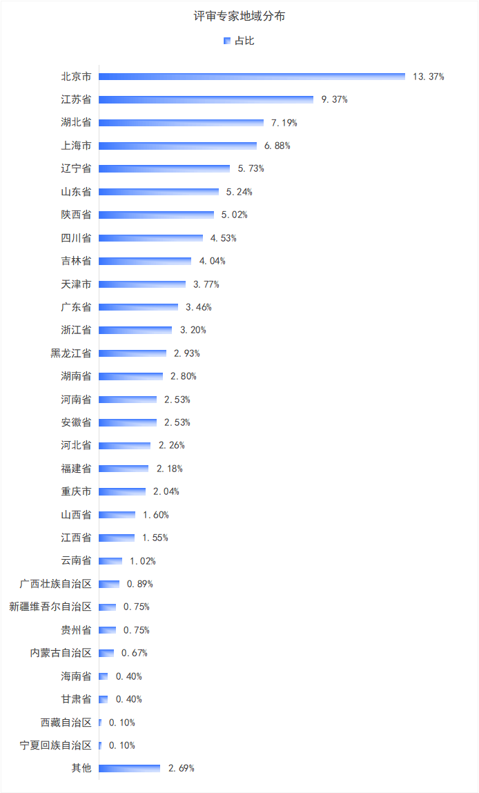 從地域分布來(lái)看,專(zhuān)家所在地占比前五的區(qū)域分別為:北京市占比13.37%,江蘇省占比9.37%,湖北省占比7.19%,上海市占比6.88%,遼寧省占比5.73%。相比之下,西藏自治區(qū)和寧夏回族自治區(qū)的占比最低??傮w來(lái)看,一方面,評(píng)審專(zhuān)家的地域分布較為廣泛,具有合理的代表性;另一方面,評(píng)審專(zhuān)家的地域分布與各地高等教育和科研資源的集聚情況、高等教育發(fā)展水平等有著密切的聯(lián)系。