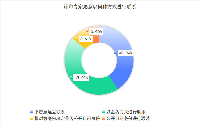 為了把握評(píng)審專(zhuān)家對(duì)于第三方評(píng)審的認(rèn)識(shí)和態(tài)度,本研究特別設(shè)立了一項(xiàng)關(guān)于評(píng)審過(guò)程中是否愿意公開(kāi)評(píng)審專(zhuān)家信息的問(wèn)題。調(diào)研詢(xún)問(wèn)評(píng)審專(zhuān)家,評(píng)審過(guò)程中您愿意以何種方式與被評(píng)人建立聯(lián)系,并設(shè)立了“不愿意建立聯(lián)系”“以匿名方式進(jìn)行聯(lián)系”“視對(duì)方身份決定是否公開(kāi)自己信息”,以及“公開(kāi)自己身份進(jìn)行聯(lián)系”四個(gè)選項(xiàng)。結(jié)果顯示,不愿意建立聯(lián)系的占到40.94%,傾向于以匿名方式進(jìn)行聯(lián)系的占到45.00%,兩者合計(jì)占比達(dá)到85.94%;愿意公開(kāi)自己身份的只占5.46%。也就是說(shuō),絕大多數(shù)專(zhuān)家認(rèn)同并且堅(jiān)持第三方評(píng)審應(yīng)當(dāng)堅(jiān)持匿名的原則。這也體現(xiàn)了評(píng)審專(zhuān)家在此方面的學(xué)術(shù)操守和道德堅(jiān)守。