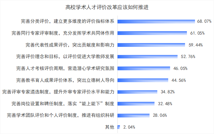 在評(píng)審專(zhuān)家看來(lái),人才評(píng)價(jià)改革應(yīng)當(dāng)如何推進(jìn)呢?調(diào)研發(fā)現(xiàn),“完善分類(lèi)評(píng)價(jià),建立更多維度的評(píng)價(jià)指標(biāo)體系”“完善同行專(zhuān)家評(píng)審制度,充分發(fā)揮學(xué)術(shù)共同體作用”,以及“完善代表性成果評(píng)價(jià),突出貢獻(xiàn)度和影響力”受到評(píng)審專(zhuān)家較為集中的認(rèn)可,占比分別達(dá)到68.07%、61.05%和59.44%。這表明評(píng)審專(zhuān)家對(duì)于分類(lèi)評(píng)價(jià)、同行評(píng)價(jià)有較高的認(rèn)可程度,對(duì)于代表性成果評(píng)價(jià)有較高的期待。