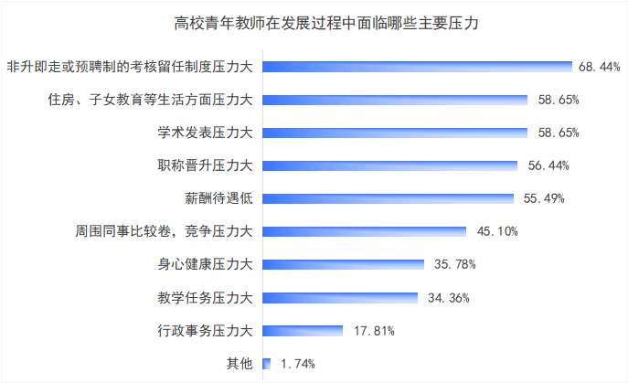 調(diào)研發(fā)現(xiàn),占比最高的是“非升即走或預(yù)聘制的考核留任制度壓力大”,高達(dá)68.44%。這表明評(píng)審專(zhuān)家認(rèn)為,高校青年學(xué)術(shù)人才面臨著比較大的考核壓力。其次是“住房、子女教育等生活方面壓力大”和“學(xué)術(shù)發(fā)表壓力大”,均占比58.65%。此外,占比超過(guò)50%的還有“職稱(chēng)晉升壓力大”“薪酬待遇低”,分別占比56.44%和55.49%。