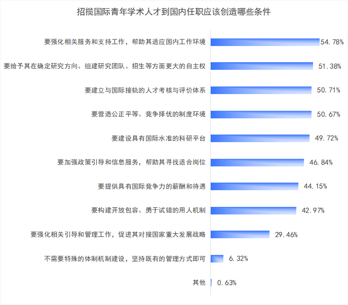 在調(diào)研籌備階段,本研究進(jìn)行了必要的專(zhuān)家訪談,收集并歸納了十項(xiàng)國(guó)際引才的“高頻條件”,分別是1. 要強(qiáng)化相關(guān)服務(wù)和支持工作,幫助其適應(yīng)國(guó)內(nèi)工作環(huán)境;2. 要給予其在確定研究方向、組建研究團(tuán)隊(duì)、招生等方面更大的自主權(quán);3. 要建立與國(guó)際接軌的人才考核與評(píng)價(jià)體系;4. 要營(yíng)造公正平等、競(jìng)爭(zhēng)擇優(yōu)的制度環(huán)境;5. 要建設(shè)具有國(guó)際水準(zhǔn)的科研平臺(tái);6. 要加強(qiáng)政策引導(dǎo)和信息服務(wù),幫助其尋找適合崗位;7. 要提供具有國(guó)際競(jìng)爭(zhēng)力的薪酬和待遇;8. 要構(gòu)建開(kāi)放包容、勇于試錯(cuò)的用人機(jī)制;9. 要強(qiáng)化相關(guān)引導(dǎo)和管理工作,促進(jìn)其對(duì)接國(guó)家重大發(fā)展戰(zhàn)略;10. 不需要特殊的體制機(jī)制建設(shè),堅(jiān)持既有的管理方式即可。