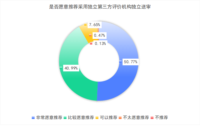 在被問(wèn)及是否愿意推薦其他用人單位采用獨(dú)立第三方評(píng)價(jià)機(jī)構(gòu)獨(dú)立送審服務(wù)的時(shí)候,50.77%的評(píng)審專(zhuān)家“非常愿意推薦”,40.99%“比較愿意推薦”,7.65%“可以推薦”,合計(jì)99.41%。