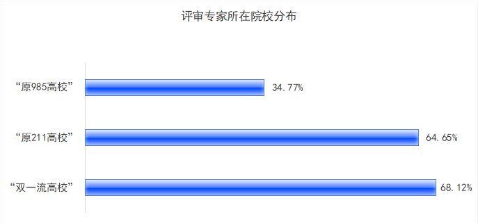 2252名評(píng)審專(zhuān)家中,98.49%為正高級(jí)職稱(chēng),1.51%為副高級(jí)職稱(chēng)。我們依據(jù)“雙一流高?!?、“原211高校”和“原985高?!钡臉?biāo)準(zhǔn)進(jìn)行統(tǒng)計(jì),結(jié)果顯示,評(píng)審專(zhuān)家當(dāng)中來(lái)自“雙一流”高校的占68.12%,其中“原985高校”占比34.77%,“原211高?!睂?zhuān)家占比64.65%??偟膩?lái)看,多數(shù)評(píng)審專(zhuān)家來(lái)自較高水平的高等院校。