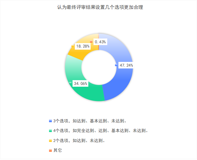 調(diào)研顯示,認(rèn)同3個(gè)選項(xiàng)的比例最高,達(dá)到47.24%。位居其次的是4個(gè)選項(xiàng),達(dá)到34.06%。相比之下,2個(gè)選項(xiàng)的設(shè)置認(rèn)同比例僅有18.28%。評(píng)審專(zhuān)家的調(diào)研結(jié)果具有一定的合理性,一般來(lái)說(shuō),評(píng)價(jià)結(jié)果的設(shè)置數(shù)量越少,評(píng)價(jià)的偏差越大;數(shù)量越多,越能夠更加清晰地展現(xiàn)評(píng)審全貌。與此同時(shí),也必須清晰地認(rèn)識(shí)到,評(píng)審結(jié)果的增加,會(huì)對(duì)評(píng)審的管理造成一定壓力,即評(píng)審結(jié)果該如何使用。