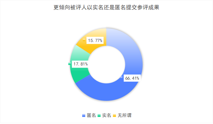 評(píng)審評(píng)估服務(wù)遵循匿名雙盲審原則,旨在打破傳統(tǒng)校際送審的人情干擾,讓人才評(píng)價(jià)更客觀、公正。對(duì)于這種制度,評(píng)審專(zhuān)家認(rèn)為是否有必要?設(shè)置是否合理?調(diào)研結(jié)果顯示,僅17.81%的評(píng)審專(zhuān)家更傾向被(參)評(píng)人以實(shí)名提交參評(píng)成果,66.41%的專(zhuān)家支持匿名提交的方式。在前述的一項(xiàng)調(diào)研中,有40.94%的評(píng)審專(zhuān)家表示不愿意與被評(píng)審人建立任何聯(lián)系,有45.00%的評(píng)審專(zhuān)家傾向于以匿名方式進(jìn)行聯(lián)系,兩者合計(jì)占比達(dá)到85.94%。通過(guò)上述調(diào)研結(jié)果,可以看出,絕大多數(shù)專(zhuān)家鮮明地支持匿名評(píng)審的機(jī)制。