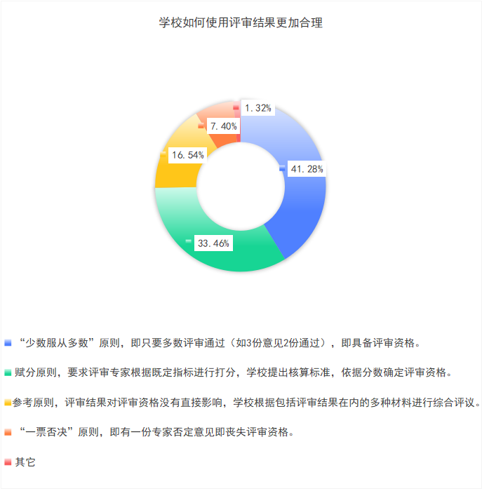 延續(xù)前一題,如何使用評(píng)審專(zhuān)家的評(píng)審結(jié)果,是實(shí)踐中的一個(gè)難題。這不僅是一個(gè)評(píng)審問(wèn)題,也是一項(xiàng)管理問(wèn)題。那么,評(píng)審專(zhuān)家對(duì)此是如何認(rèn)識(shí)的?調(diào)研顯示,占比最高的是“‘少數(shù)服從多數(shù)’原則”,有41.28%的評(píng)審專(zhuān)家支持;其次是“賦分原則”,33.46%的專(zhuān)家認(rèn)為其更合理,這意味著評(píng)審過(guò)程中應(yīng)該考慮每個(gè)評(píng)審意見(jiàn)的權(quán)重,而不是簡(jiǎn)單地以多數(shù)票決定。以上兩種原則占比合計(jì)達(dá)到74.74%。另有16.54%的評(píng)審專(zhuān)家認(rèn)同“參考原則”,即學(xué)校應(yīng)當(dāng)基于評(píng)審結(jié)果進(jìn)行綜合評(píng)議,而不是直接影響評(píng)審資格。以上三種原則,本質(zhì)上是表達(dá)了評(píng)審結(jié)果的非直接決定性。與此同時(shí),認(rèn)同“一票否決”的專(zhuān)家,占比僅7.04%。這表明,評(píng)審專(zhuān)家對(duì)于人才評(píng)審有著較為深入和系統(tǒng)的認(rèn)識(shí)。評(píng)審結(jié)果的非直接決定性,對(duì)于當(dāng)前人才評(píng)價(jià)改革有著重要參考意義。