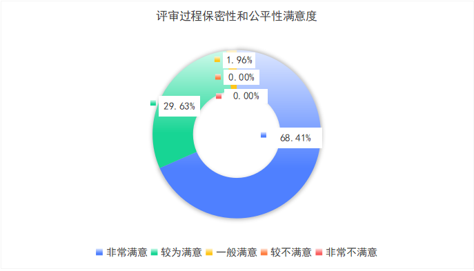 獨(dú)立第三方評(píng)價(jià)機(jī)構(gòu)在提供評(píng)審服務(wù)時(shí),能否確保被評(píng)人與專(zhuān)家信息不外泄,排除人情、學(xué)術(shù)地位以及刻板印象等主觀因素干擾,決定了評(píng)審結(jié)果的可信度和公平性。因此,保密性和公平性是衡量一個(gè)機(jī)構(gòu)是否具備外審能力的基礎(chǔ)性指標(biāo)。調(diào)研顯示,評(píng)審專(zhuān)家對(duì)獨(dú)立第三方評(píng)價(jià)機(jī)構(gòu)評(píng)審過(guò)程保密性和公平性表現(xiàn),“非常滿意”占 68.41%,“比較滿意”占 29.63%,總滿意度達(dá) 98.04%。滿意度極高,表明獨(dú)立第三方評(píng)價(jià)機(jī)構(gòu)在保密性和公平性方面,非常值得信賴(lài)和選擇。