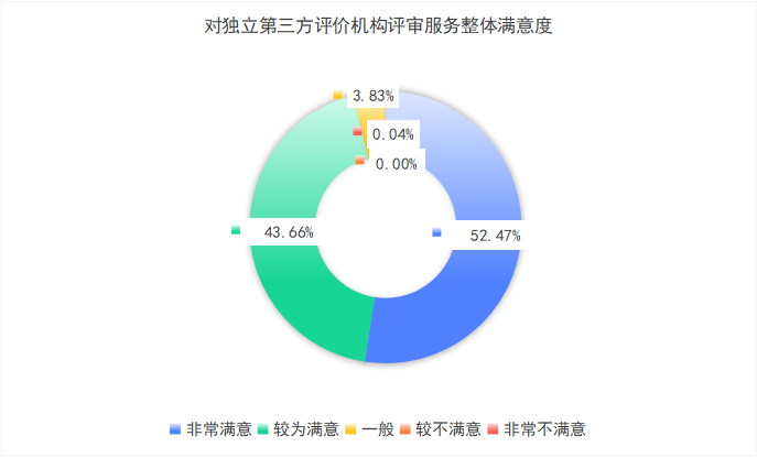 評(píng)審專(zhuān)家對(duì)獨(dú)立第三方評(píng)價(jià)機(jī)構(gòu)整體評(píng)審服務(wù)總體滿意度很高,占96.13%,其中“非常滿意”52.47%,“較為滿意”43.66%。“較不滿意”和“非常不滿意”合計(jì)僅0.04%。本次調(diào)研,充分展現(xiàn)了專(zhuān)家對(duì)于獨(dú)立第三方評(píng)價(jià)機(jī)構(gòu)評(píng)審服務(wù)的高度認(rèn)可。