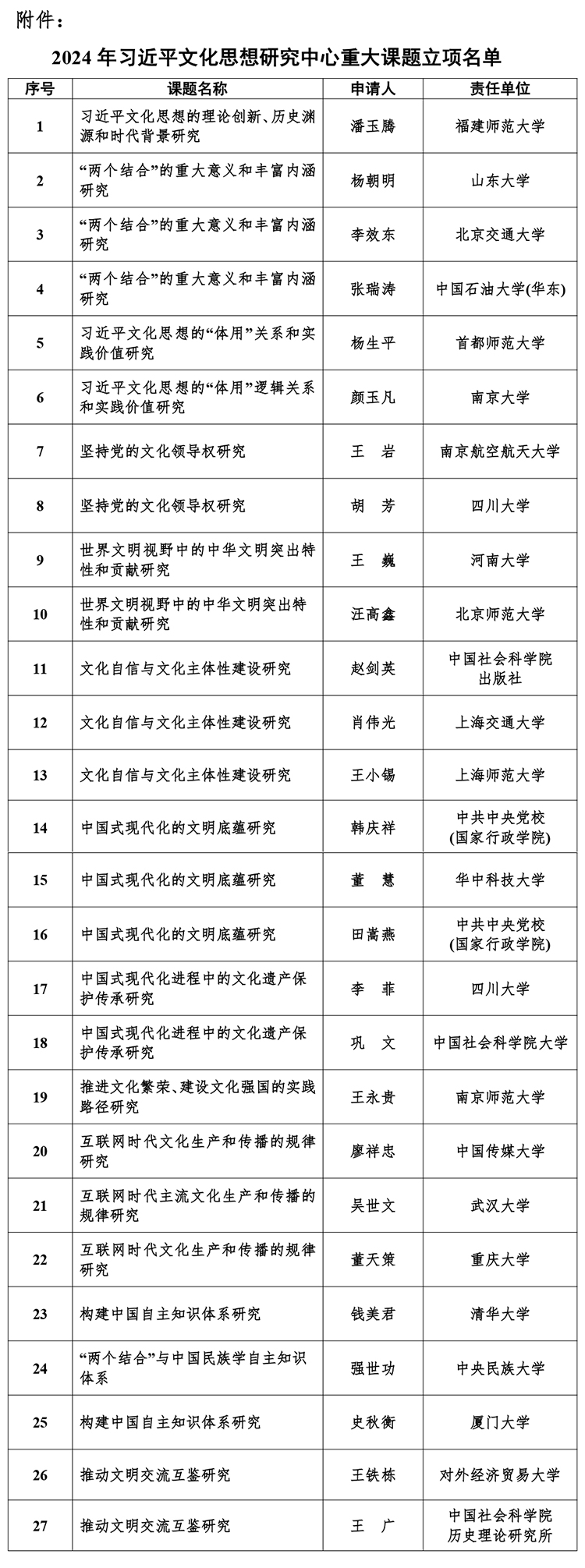 10月30日,全國哲學(xué)社會(huì)科學(xué)工作辦公室發(fā)布了《關(guān)于2024年習(xí)近平文化思想研究中心重大課題立項(xiàng)名單的公示》。名單顯示,本年度共有27個(gè)重大課題獲批立項(xiàng),其中包含22所高校。值得一提的是,四川大學(xué)是全國唯一一所有2個(gè)重大課題立項(xiàng)的高校。