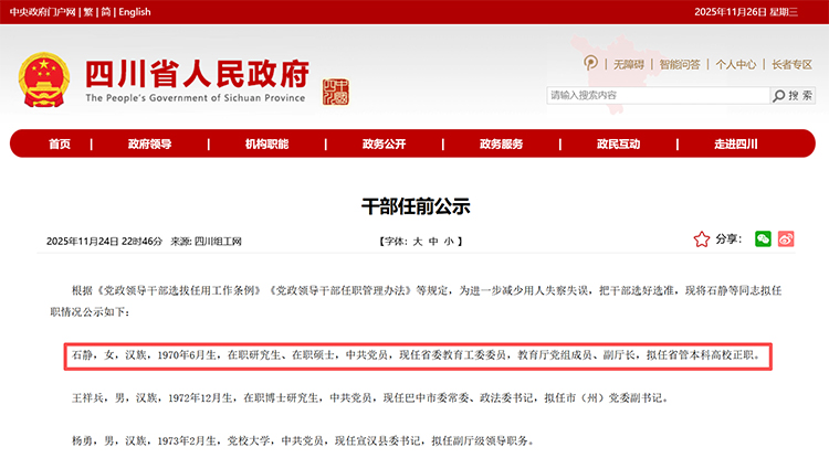 公示!四川省教育廳副廳長(zhǎng),擬任本科高校正職